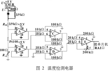 此時有U7E=100UiA-200IB,電位器Rv3用來調(diào)零,當(dāng)其阻值調(diào)至和Pt100阻值相同時,此時U7E為零,未調(diào)整時即為常溫值。其原理如圖2所示.