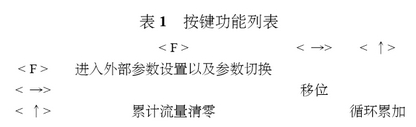 AD轉(zhuǎn)換器采集角位移傳感器輸出電壓信號,采集時(shí)間間隔為10ms,采集的電壓值經(jīng)數(shù)字濾波后,用于流量計(jì)算;鍵盤處理模塊采用中斷方式,根據(jù)鍵值,實(shí)現(xiàn)表1所示功能。
