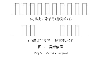 由于卡門渦街流量計信號是由旋渦頻率數(shù)值來.體現(xiàn)的,在正常情況下,旋渦分離頻率是穩(wěn)定的,只有當(dāng)傳感器發(fā)生異?;蚬r發(fā)生變化時,旋渦分離頻率才會有很大的變化,因此,通過觀察渦街流量傳感器頻率變化范圍的大小,可以很方便的分析出傳感器是否存在故障,不會出現(xiàn)模擬類傳感器在使用時因為零點偏移或模擬轉(zhuǎn)換誤差而帶來不易發(fā)現(xiàn)的計量誤差。渦街信號如圖5所示