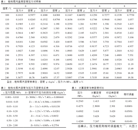 根據(jù)經(jīng)驗公式,飽和水蒸汽密度與壓力及密度的關(guān)系(4)如表2。