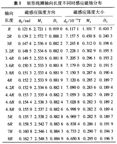對于電磁流量計中的矩形線圈,將所考慮橫截面區(qū)域劃分成41x41個網(wǎng)格,令矩形線圈的寬為6cm,等于管道內(nèi)徑2R。每個勵磁線圈的匝數(shù)為6,厚度為2cm,2個線圈之間的距離為6cm,緊貼測量管壁,線圈中電流強度為10mA。首先令矩形線圈軸向長度的范圍從R到8R,間隔為R;其次,在前面所確定最優(yōu)尺寸4R附近,提高尺度分辨率,從3R到5R,間隔為0.2R??疾榫匦尉€圈在測量管橫截面上的感應(yīng)磁場分布情況,如表1所示。