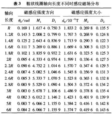 取鞍狀線圈圓弧段的弧度為154°,首先取線圈的軸向長度范圍R~6R,間隔為R;其次在最優(yōu)尺寸2R附近,提高尺度分辨率,從R到3R,間隔為0.2R??疾榘盃罹€圈在電極橫截面上的感應(yīng)磁場分布情況,如表3所示。