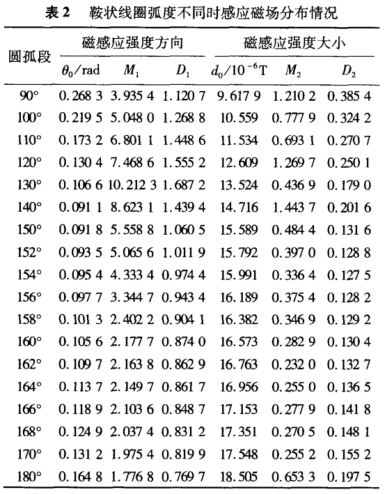 由表2可知,當(dāng)鞍狀線圈圓弧段的弧度為154°時,D2達到最小值,D、取值0.9744,同時感應(yīng)磁場方向指標(biāo)θ。為0.0954,與最小值0.0911相差不大,綜合考慮選鞍狀線圈圓弧段的最優(yōu)弧度為154°。