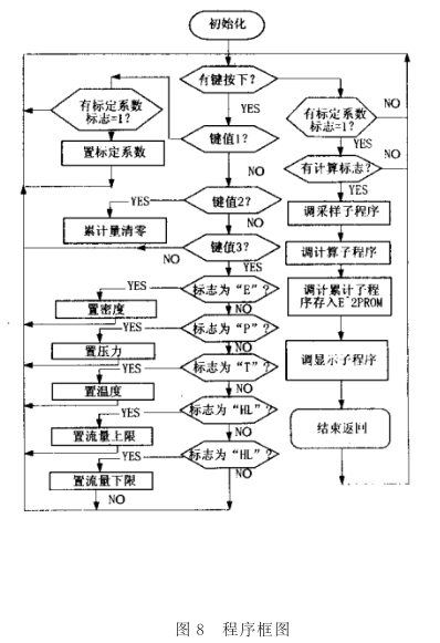 軟件設(shè)計(jì)流程如圖8所示??蓪?shí)現(xiàn)雙排8位LCD同時(shí)顯示累積流量和瞬時(shí)流量;通過(guò)儀表界面3個(gè)按鍵可將標(biāo)定曲線系數(shù)、小數(shù)位數(shù)、被測(cè)介質(zhì)的密度、溫度、壓力、壓縮系數(shù)等工況參數(shù)直接置入單片機(jī),自動(dòng)完成刻度換算,實(shí)現(xiàn)流量的精確測(cè)量,給不同要求用戶的使用帶來(lái)極大方便,無(wú)需逐臺(tái)設(shè)計(jì)制造,與國(guó)際同類研究成果相比較,金屬管浮子流量計(jì)顯示出更強(qiáng)的智能化水平。