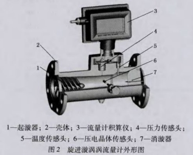 旋進漩渦流量計主要由起旋器、文丘里管、消旋器和檢測元件組成。其結(jié)構(gòu)原理如圖1所示,外形如圖2所示,當(dāng)流體流進旋進漩渦流量計后,在起旋器的作用下,被強制圍繞中心線旋轉(zhuǎn),產(chǎn)生漩渦流,漩渦流在文丘利管中旋進,到達收縮段突然節(jié)流后,使漩渦流加速,當(dāng)通過擴散段時,漩渦中心沿一錐形旋線進動。此時,由兩個壓電傳感器檢測到的進動頻率信號經(jīng)前置電路放大,濾波,整形后轉(zhuǎn)換為兩路與流速正比的脈沖信號,經(jīng)積算儀中處理電路進行相應(yīng)的比較和判斷,并剔除外來干擾信號后,正常的流量信號與溫度,壓力傳感器檢測到的信號-起送人智能流量積算儀進行運算處理,并把流體的體積流量和總量直接顯示于LCD屏上。