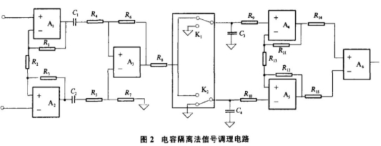 現(xiàn)在很多電磁流量計(jì)的信號(hào)處理方法采用了電容隔離法,電容隔離法是將零點(diǎn)漂移近似作為直流.處理的一種方法,即通過(guò)電容耦合來(lái)隔離零點(diǎn)漂移干擾,實(shí)現(xiàn)對(duì)感應(yīng)電勢(shì)信號(hào)的提取.放大處理.基本電路如圖2.