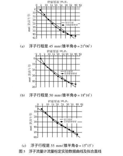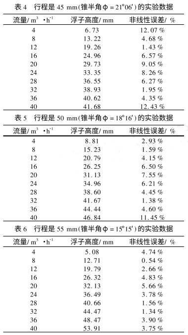 對(duì)比.上述兩組最大非線性誤差和平均非線性誤差的數(shù)值可以看出,當(dāng)浮子行程為45mm、50mm,55mm,相應(yīng)的錐半角為φ=21°06'φ=18°16'φ=15°15'時(shí)浮子流量計(jì)非線性誤差的最大值和平均值也都有了很明顯的減小,其中金屬管浮子流量計(jì)的線性度即最大非線性誤差分別為γmax=12.43%γmax=11.45%γmax=5.66%,儀表的線性度得到了很好的.改善.