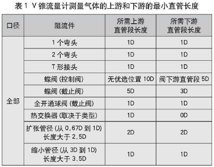 (1)氣體測量,雷諾數(shù)范圍(Re)>200000,V錐流量計測量氣體的上游和下游的最小直管長度見表1。若≥0.65,表中的直管段長度需要增加1D。