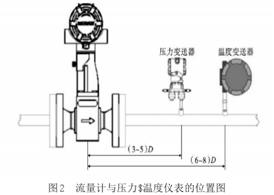 具體安裝實踐中對流量計前后直管段提出十分嚴格的要求,流量計上游要確保有10D~35D的直管段(D是管道直徑),下游直管段要≥5D,結(jié)合上游區(qū)域內(nèi)是否存有無直角彎、擴大管、縮徑管等情況設定上游直管段的具體長度。在這里筆者重點提及的一點內(nèi)容是,當直管段的安裝符合設計要求時,盡量將流量安裝在前后直管段偏大的管道.上,借此方式確保流量計上”下游節(jié)流件所形成的紊流不會降低測量結(jié)果的精準度。結(jié)合實際流體測量的現(xiàn)實需求,需要在渦街流量計檢測壓力與溫度值,建議將測壓點、測溫點分別設定在傳感器下游的3D^5D、6D8D位置(圖2)。