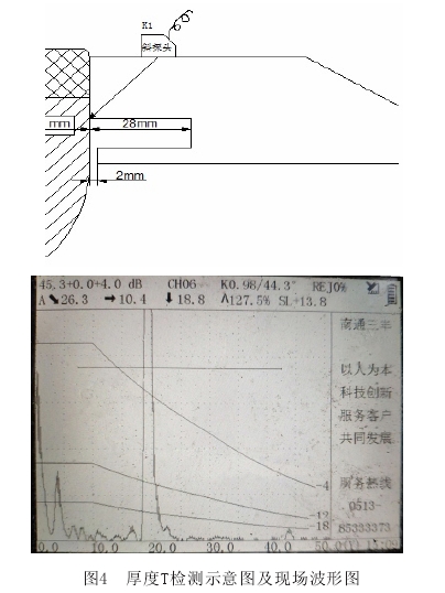 由于焊縫未與噴嘴融合在一-起,無法利用斜探頭測量焊縫厚度,所以必須磨平一小塊焊縫余高,磨平范圍約為直探頭大小,將直探頭置于磨平余高焊縫處,此處接收到的最大回波信號所示深度即為焊縫厚度t。同樣利用測厚儀也可測量出焊縫厚度。