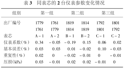 將每組儀表的2臺表芯對換,重新進(jìn)行檢定,獲取檢定數(shù)據(jù),列于表2。將同表芯的2臺儀表參數(shù)進(jìn)行比較,獲得比對結(jié)果,列于表3。其中儀表系數(shù)以相對變化(百分?jǐn)?shù))表示。