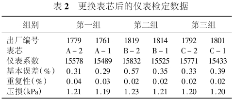 由表3中數(shù)據(jù)可以看出,渦輪流量計的儀表系數(shù)主要和表芯有關(guān),這是由于表芯幾乎集中了該表的所有重要零部件,包括影響儀表性能的軸承和葉輪。渦輪流量計一次表的損壞主要是軸承和葉輪,因此既不提倡單獨更換軸承或葉輪進(jìn)行維修,也不需要更換整臺儀表,而是采用整體更換表芯的方式即可。每一個用于維修的表芯都需要進(jìn)行單獨標(biāo)定,每一個表芯都可確定一個儀表系數(shù),更換表芯后,輸入新的儀表系數(shù)就可以投入使用了。