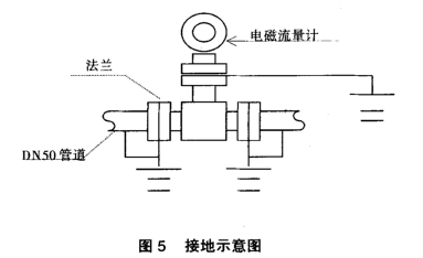 電磁流量計(jì)是基于導(dǎo)電性流體在磁場中運(yùn)動(dòng)所產(chǎn)生的感應(yīng)電動(dòng)勢(shì)來推算流體流量的測(cè)量儀表,其基本工作原理是電磁感應(yīng)定律。因此電磁耦合、靜電感應(yīng)是電磁流量計(jì)干擾噪聲的首要來源,在管線上存在雜.散電壓干擾。為了保證液體與地同電位,避免液體與.地有電位差以及因空間電磁干擾而造成的測(cè)量誤差,所以,對(duì)接地做了嚴(yán)格的要求。本裝置與管道為固定法蘭連接,固定法蘭和管道以及流量傳感器均用2.5mm2的銅芯線作了良好的接地見圖5。