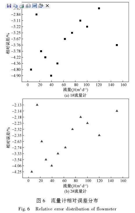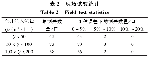 圖6分別為對1#電磁流量計和2#電磁流量計利用在清水中層流流態(tài)的測量數(shù)據(jù)獲得的標(biāo)定方程計算濃度為1500mg/L聚合物溶液流量的相對誤差分布圖,1#電磁流量計和2#電磁流量計最大相對誤差的絕對值分別為4.90%和4.25%,符合流量測量誤差要求,證實本文提出的電磁流量計新方法有效、可行。最后,對2支電磁流量計,通過開展分層注聚合物井的現(xiàn)場測調(diào)試驗,對所提出的分層注聚合物井的電磁流量計新方法進行驗證,以評價現(xiàn)場實際應(yīng)用效果。表2所示為對2支電磁流量計完成的現(xiàn)場試驗情況統(tǒng)計表,總共完成分層注聚合物井現(xiàn)場試驗176口,全井注人流量小于50m³/d的分層注聚合物井共45口,其中測量誤差小于5%的井占比95.6%;全井注人流量在50~100m³/d的分層注聚合物井共試驗73口其中測量誤差小于5%的井占比95.9%;全井注人流量在100~200m³/d的分層注聚合物井共試驗58口,其中測量誤差小于5%的井占比96.6%;現(xiàn)場試驗證明所提出的分層注聚合物井的電磁流量計方法應(yīng)用效果良好。