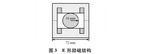 E形框架亥姆霍茲線(xiàn)圈是一種在傳統(tǒng)的亥姆霍茲線(xiàn)圈中加入導(dǎo)磁材料制成的E形框架來(lái)模擬磁場(chǎng)的分布的改進(jìn)勵(lì)磁結(jié)構(gòu)。常用的勵(lì)磁裝置亥姆霍茲線(xiàn)圈具有2個(gè)平行排列的線(xiàn)圈,并且測(cè)量管中的磁流場(chǎng)是2個(gè)線(xiàn)圈產(chǎn)生的磁場(chǎng)的疊加。為了減少在線(xiàn)圈邊緣漏磁通的影響,一種由導(dǎo)磁材料構(gòu)成的E形勵(lì)磁框架,如圖3所示。線(xiàn)圈纏繞在E形框架的中心,整個(gè)勵(lì)磁裝置由2個(gè)彼此相對(duì)放置的E形框架組成。線(xiàn)圈形狀是矩形的,由于E形框架具有高導(dǎo)磁率,磁力線(xiàn)可以集中在E形框架的中心區(qū)域,以提高穿過(guò)測(cè)量管的磁場(chǎng)的強(qiáng)度和均勻性,并且可以減小激勵(lì)裝置的尺寸。其中,E形框架亥姆霍茲線(xiàn)圈沿著測(cè)量管的軸向長(zhǎng)度是48mm,即測(cè)量管半徑的3倍。此種結(jié)構(gòu)具有漏磁小、磁場(chǎng)分布均勻等優(yōu)點(diǎn)??蓪⒋磐考性跍y(cè)量管周?chē)膮^(qū)域以確保有足夠的磁場(chǎng)強(qiáng)度來(lái)檢測(cè)流量流速信號(hào)。.
