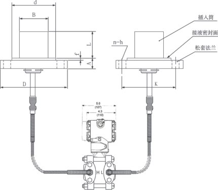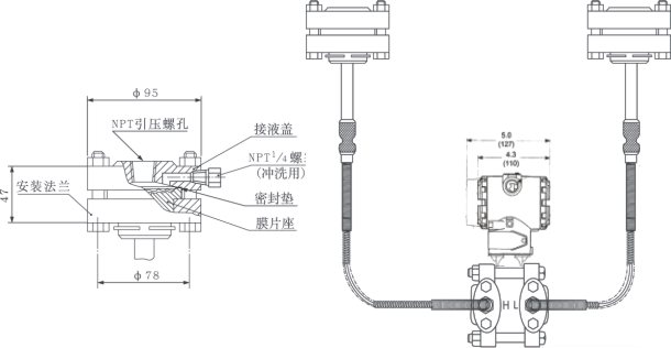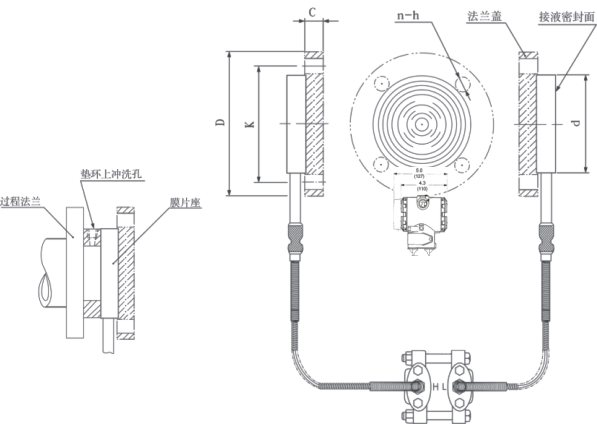 ② 遠傳裝置的工作溫度,由所選擇的灌充液種類確定。 ③ 遠傳差壓變送器的介質溫度影響是指兩側的遠傳裝置由室溫開始同時受到相同的溫度作用,所產生的輸出變化。 ④ 靜壓和溫度影響,均是在最大量程時測得。 ⑤ DP型遠傳差壓變送器兩側的毛細管最大長度為7.5米,兩側長度差為4.5米。 平法蘭(RFW)遠傳差壓變送器